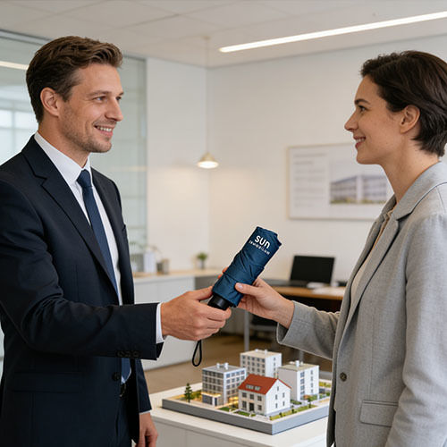 As a leading corporate gifts supplier Germany, we specialize in high-quality branded merchandise for real estate and business professionals. Our SUN IMMOBILIE custom umbrellas are designed specifically for corporate gifts bulk orders, offering exceptional value and brand visibility.
